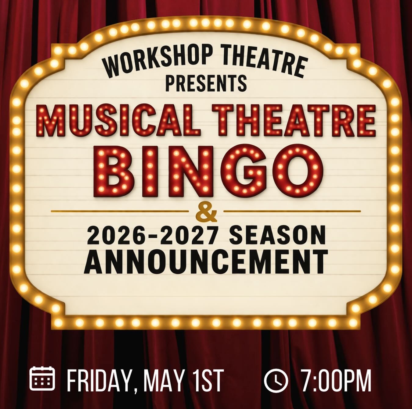 It’s that time again! Join us on May 1st at 7pm for the 3rd annual Musical Theatre Bingo where we will announce our 2026-27 MainStage season! $10 at the door gets you 4 rounds of bingo cards. Want more chances to win? You can pay for extra cards! Join us!